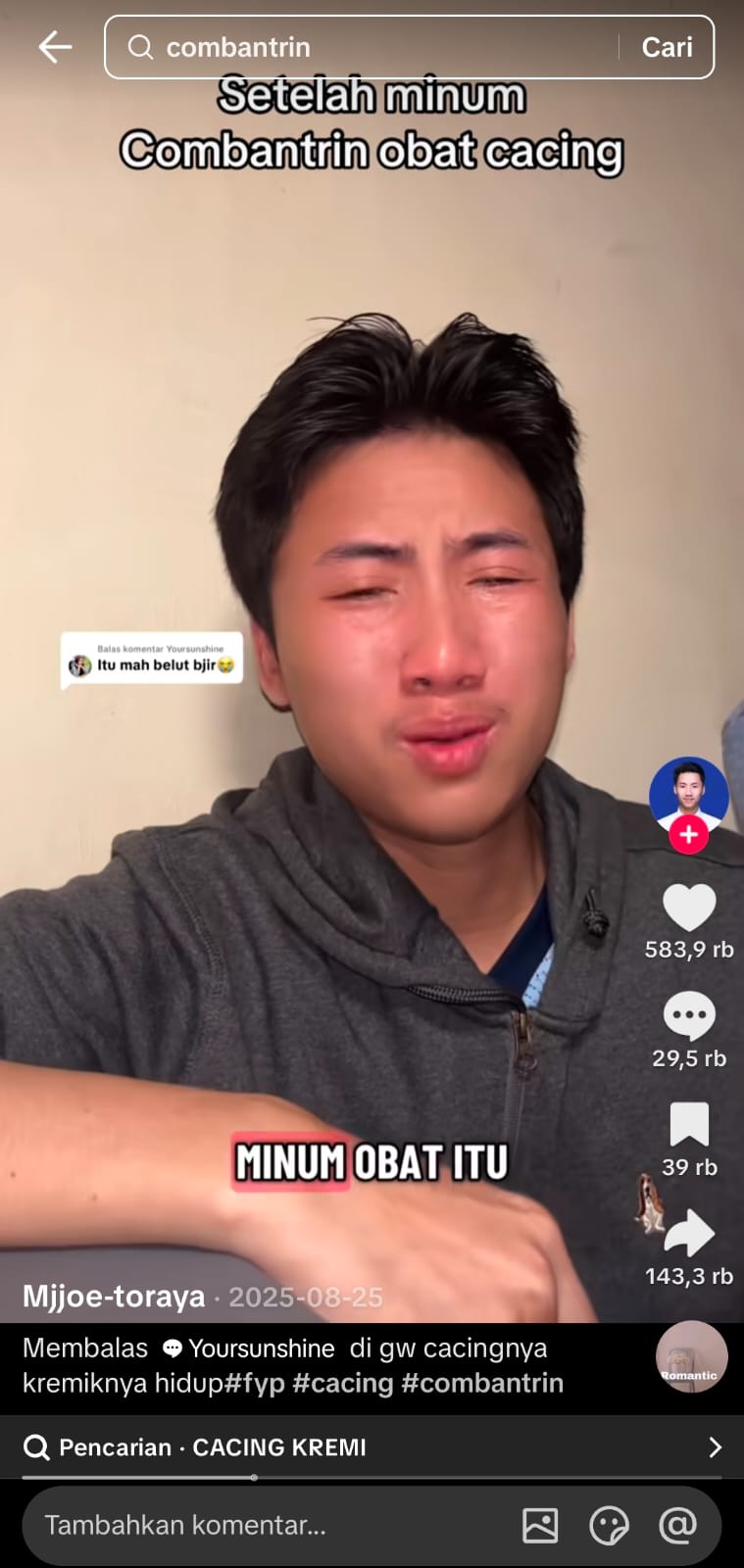 Salah satu unggahan viral memperlihatkan reaksi seorang remaja yang memejamkan mata dan mengerutkan wajah setelah meminum obat cacing Combantrin. Video tersebut dikemas dengan humor sehingga tampak menghibur, tetapi justru membuat konsumsi obat cacing terlihat ringan dan tidak berisiko. Padahal, ekspresi dramatis itu kemungkinan dibuat untuk hiburan dan bukan reaksi medis nyata. Konten seperti ini dapat menyesatkan, terutama bagi remaja dengan literasi kesehatan rendah, karena membuat mereka menganggap obat cacing sebagai tantangan yang aman dilakukan.